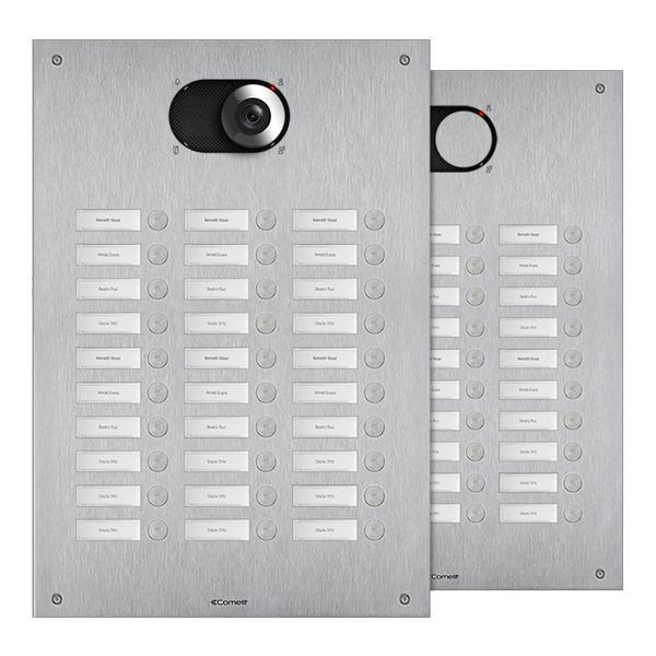 Frontplatte Serie Switch, 30 Teilnehmer, 3-reihig, SB2, VIP. Zu vervollständigen mit dem UP-Gehäuse IX9155 oder AP-Gehäuse IX9165 sowie mit dem Lautsprecher Audio oder Video (Systemabhängig) Art. 1621, 1621VC, 1682, 4680C, 4681 oder 4682HD. Frontplatte aus 2,5mm starker Edelstahlplatte V4A und dreißig flächenbündig integrierten Klingeltasten. Namensschilder von vorne zu wechseln, inkl. rückseitiger LED-Beleuchtung. Integriertes Ausstattungsmerkmal ist die Handicap-Funktion nach DIN 18040 mit Zustandsanzeige Türruf, Gesprächsbereit, Türöffnerfunktion und Teilnehmererreichbarkeit visuell mit LED´s hinter genormten Handicap Symbolen sowie akustischer Sprachausgabe der Zustände. Zu verwenden mit Netzgerät Art. 1210. Schlagfestigkeit: IK08. Abmessungen: 448,9x302,9x2,5mm.
