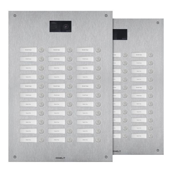 Frontplatte Serie Steel-Switch, 33 Teilnehmer, 3-reihig, universell. Zu vervollständigen mit dem UP-Gehäuse IX9155 oder AP-Gehäuse IX9165 sowie mit dem Lautsprecher Audio oder Audio-Video (Systemabhängig) der Ultra Serie EUxxxx. Die Lautsprecherhalter EU1250A und EU1250V sind enthalten. Frontplatte aus 2,5mm starker Edelstahlplatte V4A und dreiunddreißig flächenbündig integrierten Klingeltasten. Namensschilder von vorne zu wechseln, inkl. rückseitiger LED-Beleuchtung. Integriertes Ausstattungsmerkmal ist die Handicap-Funktion nach DIN 18040 mit Zustandsanzeige Türruf, Gesprächsbereit, Türöffnerfunktion und Teilnehmererreichbarkeit visuell mit LED´s hinter genormten Handicap Symbolen sowie akustischer Sprachausgabe der Zustände. Schlagfestigkeit: IK08. Abmessungen: 448,9x302,9x2,5mm.