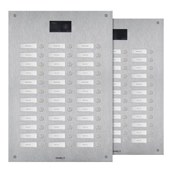 Frontplatte Serie Steel-Switch, 36 Teilnehmer, 3-reihig, universell. Zu vervollständigen mit dem UP-Gehäuse IX9180 oder AP-Gehäuse IX9176 sowie mit dem Lautsprecher Audio oder Audio-Video (Systemabhängig) der Ultra Serie EUxxxx. Die Lautsprecherhalter EU1250A und EU1250V sind enthalten. Frontplatte aus 2,5mm starker Edelstahlplatte V4A und sechsunddreißig flächenbündig integrierten Klingeltasten. Namensschilder von vorne zu wechseln, inkl. rückseitiger LED-Beleuchtung. Integriertes Ausstattungsmerkmal ist die Handicap-Funktion nach DIN 18040 mit Zustandsanzeige Türruf, Gesprächsbereit, Türöffnerfunktion und Teilnehmererreichbarkeit visuell mit LED´s hinter genormten Handicap Symbolen sowie akustischer Sprachausgabe der Zustände. Schlagfestigkeit: IK08. Abmessungen: 502x303x2,5mm.