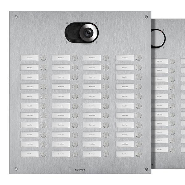 Frontplatte Serie Switch, 44 Teilnehmer, 4-reihig, SB2, VIP. Zu vervollständigen mit dem UP-Gehäuse IX9181 oder AP-Gehäuse IX9177 sowie mit dem Lautsprecher Audio oder Video (Systemabhängig) Art. 1621, 1621VC, 1682, 4680C, 4681 oder 4682HD. Frontplatte aus 2,5mm starker Edelstahlplatte V4A und vierundvierzig flächenbündig integrierten Klingeltasten. Namensschilder von vorne zu wechseln, inkl. rückseitiger LED-Beleuchtung. Integriertes Ausstattungsmerkmal ist die Handicap-Funktion nach DIN 18040 mit Zustandsanzeige Türruf, Gesprächsbereit, Türöffnerfunktion und Teilnehmererreichbarkeit visuell mit LED´s hinter genormten Handicap Symbolen sowie akustischer Sprachausgabe der Zustände. Zu verwenden bei Buslautsprechern mit Netzgerät Art. 1210 zzgl. Art. 1595, ViP auf Nachfrage. Schlagfestigkeit: IK08. Abmessungen: 502x409x2,5mm.