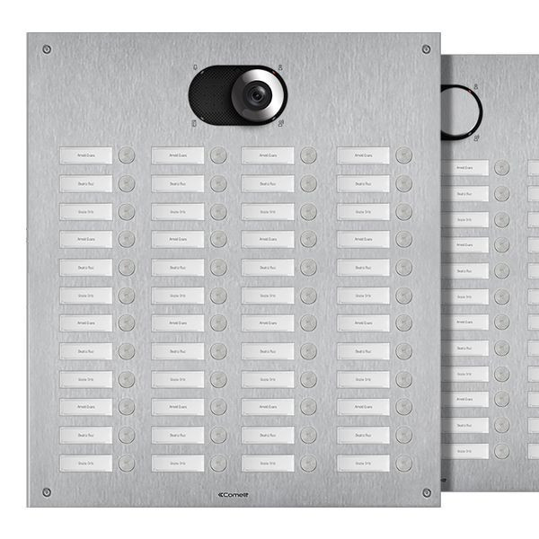 Frontplatte Serie Switch, 48 Teilnehmer, 4-reihig, SB2, VIP. Zu vervollständigen mit dem UP-Gehäuse IX9181 oder AP-Gehäuse IX9177 sowie mit dem Lautsprecher Audio oder Video (Systemabhängig) Art. 1621, 1621VC, 1682, 4680C, 4681 oder 4682HD. Frontplatte aus 2,5mm starker Edelstahlplatte V4A und achundvierzig flächenbündig integrierten Klingeltasten. Namensschilder von vorne zu wechseln, inkl. rückseitiger LED-Beleuchtung. Integriertes Ausstattungsmerkmal ist die Handicap-Funktion nach DIN 18040 mit Zustandsanzeige Türruf, Gesprächsbereit, Türöffnerfunktion und Teilnehmererreichbarkeit visuell mit LED´s hinter genormten Handicap Symbolen sowie akustischer Sprachausgabe der Zustände. Zu verwenden bei Buslautsprechern mit Netzgerät Art. 1210 zzgl. Art. 1595, ViP auf Nachfrage. Schlagfestigkeit: IK08. Abmessungen: 502x409x2,5mm.