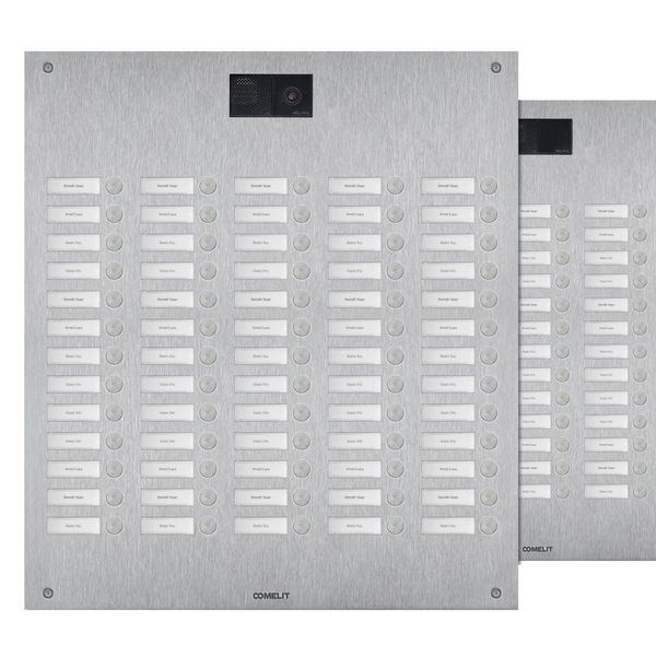 Frontplatte Serie Steel-Switch, 65 Teilnehmer, 5-reihig, universell. Zu vervollständigen mit dem UP-Gehäuse IX9182 oder AP-Gehäuse IX9178 sowie mit dem Lautsprecher Audio oder Audio-Video (Systemabhängig) der Ultra Serie EUxxxx. Die Lautsprecherhalter EU1250A und EU1250V sind enthalten. Frontplatte aus 2,5mm starker Edelstahlplatte V4A und fünfundsechzig flächenbündig integrierten Klingeltasten. Namensschilder von vorne zu wechseln, inkl. rückseitiger LED-Beleuchtung. Integriertes Ausstattungsmerkmal ist die Handicap-Funktion nach DIN 18040 mit Zustandsanzeige Türruf, Gesprächsbereit, Türöffnerfunktion und Teilnehmererreichbarkeit visuell mit LED´s hinter genormten Handicap Symbolen sowie akustischer Sprachausgabe der Zustände. Schlagfestigkeit: IK08. Abmessungen: 502x495x2,5mm.