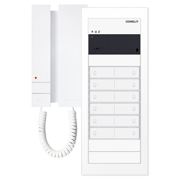 Paketlösung Ultra Audio inklusive Mini mit Hörer, SB2, UP, weiss. Es können maximal 4 Innenstationen Audio, pro Teilnehmer, installiert werden. Dieses Kit besteht aus: 1x UP-Gehäuse 3110/3A, 1x Unterputzrahmen UT9163W, 1x Lautsprecher Audio UT2010W, 2x Tastenmodul UT9200, 3x Tastenabdeckung Blind UT9221MW, 6x Tastenabdeckung UT9212, 1x Netzgerät 1210, 12x Innenstation Audio Mini mit Hörer 2738W/A.