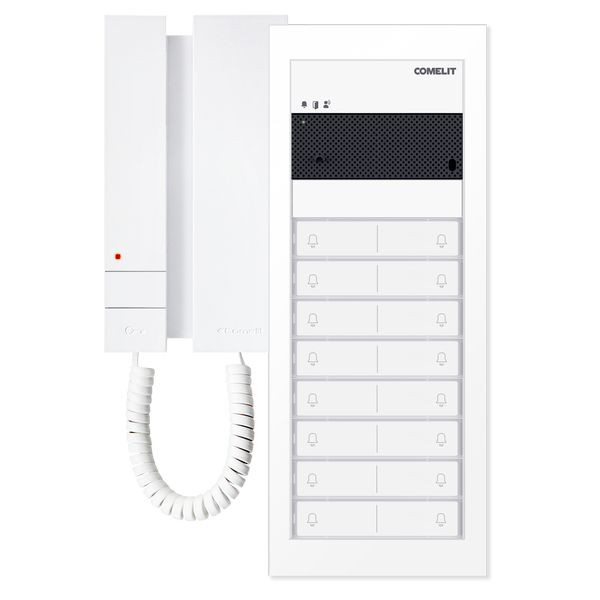 Paketlösung Ultra Audio inklusive Mini mit Hörer, SB2, UP, weiss. Es können maximal 4 Innenstationen Audio, pro Teilnehmer, installiert werden. Dieses Kit besteht aus: 1x UP-Gehäuse 3110/3A, 1x Unterputzrahmen UT9163W, 1x Lautsprecher Audio UT2010W, 2x Tastenmodul UT9200, 1x Tastenabdeckung Blind UT9221MW, 8x Tastenabdeckung UT9212, 1x Netzgerät 1210, 15x Innenstation Audio Mini mit Hörer 2738W/A.