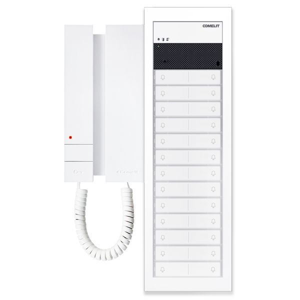 Paketlösung Ultra Audio inklusive Mini mit Hörer, SB2, UP, weiss. Es können maximal 4 Innenstationen Audio, pro Teilnehmer, installiert werden. Dieses Kit besteht aus: 1x UP-Gehäuse 3110/4A, 1x Unterputzrahmen UT9164W, 1x Lautsprecher Audio UT2010W, 3x Tastenmodul UT9200, 13x Tastenabdeckung UT9212, 1x Netzgerät 1210, 26x Innenstation Audio Mini mit Hörer 2738W/A.
