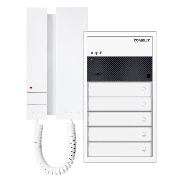 Paketlösung Ultra Audio inklusive Mini mit Hörer, SB2, AP, weiss. Es können maximal 4 Innenstationen Audio, pro Teilnehmer, installiert werden. Dieses Kit besteht aus: 1x Aufputzrahmen UT9172W, 1x Lautsprecher Audio UT2010W, 1x Tastenmodul UT9200, 5x Tastenabdeckung UT9211, 1x Netzgerät 1210, 5x Innenstation Audio Mini mit Hörer 2738W/A.