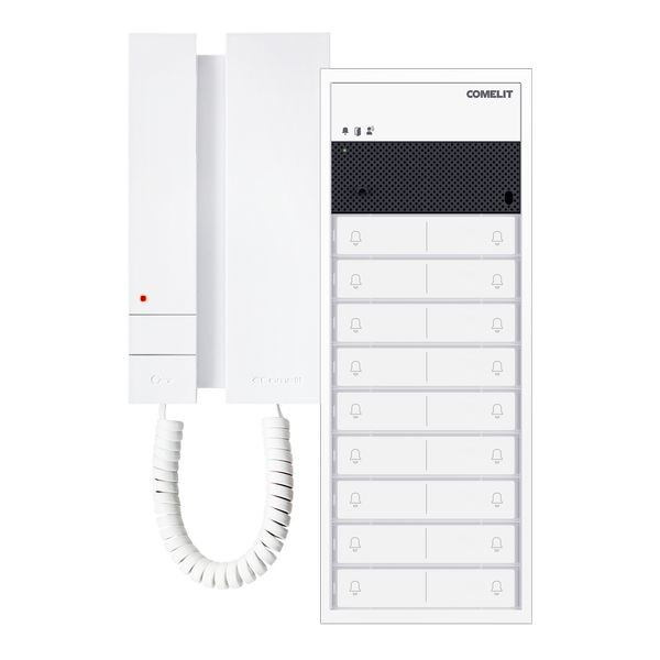 Paketlösung Ultra Audio inklusive Mini mit Hörer, SB2, AP, weiss. Es können maximal 4 Innenstationen Audio, pro Teilnehmer, installiert werden. Dieses Kit besteht aus: 1x Aufputzrahmen UT9173W, 1x Lautsprecher Audio UT2010W, 2x Tastenmodul UT9200, 9x Tastenabdeckung UT9212, 1x Netzgerät 1210, 18x Innenstation Audio Mini mit Hörer 2738W/A.