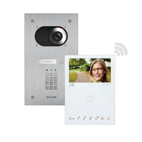 Einfamilienhauskit Switch mit Codetastatur (KeyPad) und Mini Handsfree Wi-Fi, SB2. Dieses Kit ist im Auslieferungszustand komplett auf Adresse 1 voradressiert und muss lediglich installiert und elektrisch angeschlossen werden. Es können maximal 4 Innenstationen Audio oder Video im Master / Slave Modus installiert werden. Der Mini HF WiFi ist mit einem WiFi Modul ausgestattet welches es ermöglicht die Innenstation mit dem eigenen WiFi Heimnetzwerk zu verbinden. Im Google PlayStore oder Apple AppStore muss die Comelit App heruntergeladen und das Smartphone mittels Smartregistrierung mit der Innenstation verbunden werden. Somit ist der Video-Türruf inkl. Audiokommunikation im WiFi und 3G Netz erreichbar. Mit der Codetastatur können, unabhängig voneinander, zwei verschiedene Ralais (NO/NC/COM; NO/COM)angesteuert werden um beispielsweise einen Türöffner, ein Motorschloss oder eine Tor zu betätigen. Dieses Kit besteht aus: 1x Frontplatte Switch Art. IX0101KP, 1x UP-Gehäuse Art. IX9150, 1x Lautsprecher Video Art. 4681/4, 1x SK9015 Anschlussmodul, 1x Netzgerät Art. 1210A, 1x Innenstation Video Mini HF WiFi Art. 6741W, 1x Abzweigklemme Art. 1214/2C und 1x Abschlusswiderstand Art. 1216.