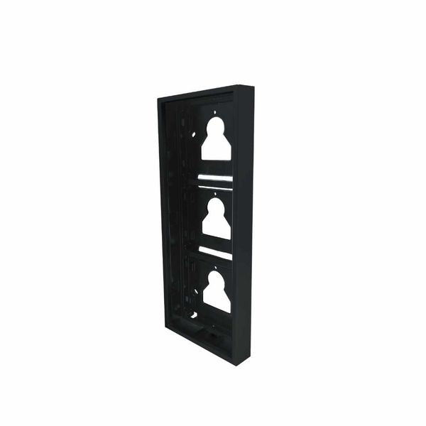 Aufputzgehäuse für Ultra, 3 Module. Es besteht aus der Metallhalterung zur Befestigung der Module ohne den Einsatz von Schrauben, sowie dem Rahmen aus kataphoresebehandeltem Aluminiumdruckguss zur Erhöhung der Beständigkeit gegen chemische und umweltbedingte Korrosionsprozesse, einschließlich UV-Strahlen. Überstand von der Wand nur 35 mm. Farbe: schwarz. Abmessungen: 110x289x35mm.