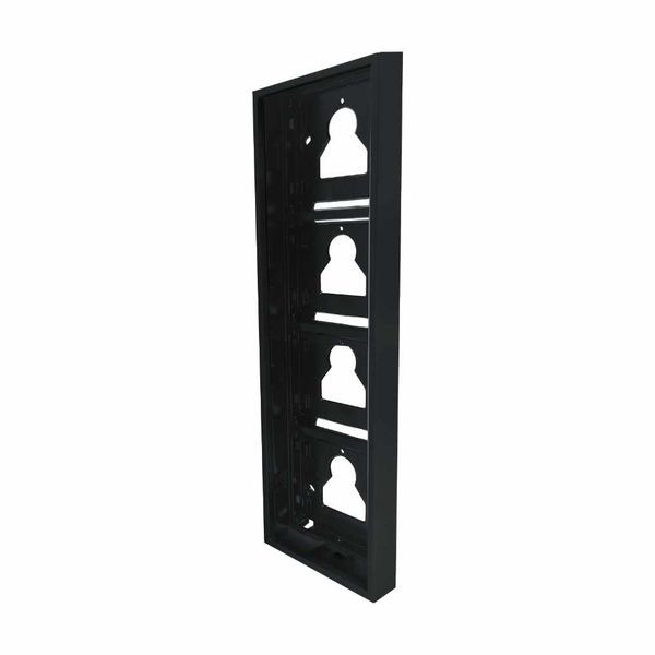 Aufputzgehäuse für Ultra, 4 Module. Es besteht aus der Metallhalterung zur Befestigung der Module ohne den Einsatz von Schrauben, sowie dem Rahmen aus kataphoresebehandeltem Aluminiumdruckguss zur Erhöhung der Beständigkeit gegen chemische und umweltbedingte Korrosionsprozesse, einschließlich UV-Strahlen. Überstand von der Wand nur 35 mm. Farbe: schwarz. Abmessungen: 110x380x35mm.