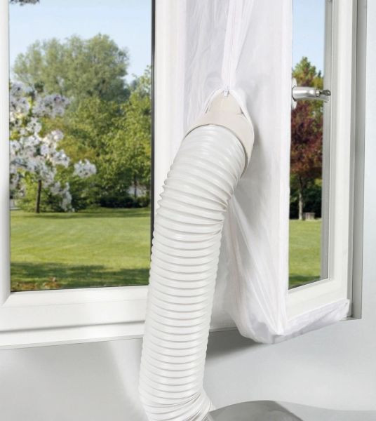 Hot Air Stop Fensterabdichtung für mobile Klimageräte - weiß, passend für alle gängigen Fenstergrößen mit einem Umlaufmaß von bis zu 400 cm. Zudem erlaubt diese Fensterabdichtung das Fenster weiterhin normal zu öffnen und zu schließen