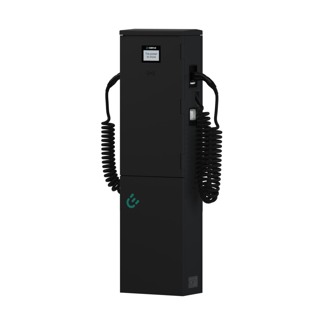 Die DUO fleet outdoor cable SAM verfügt über 2 Ladekabel (Spiralkabel mit 6,5 m Länge) für sicheres, eichrechtskonformes Laden mit 2 x 11 kW (AC). Die DUO fleet denkt größer - an mehr Ladepunkte, weniger Netzausbau und schonenden Ressourceneinsatz. Dank Power-Rail-Technologie werden mehrere Ladestationen in Reihe geschaltet und so bis zu 50 % Errichtungskosten gespart.