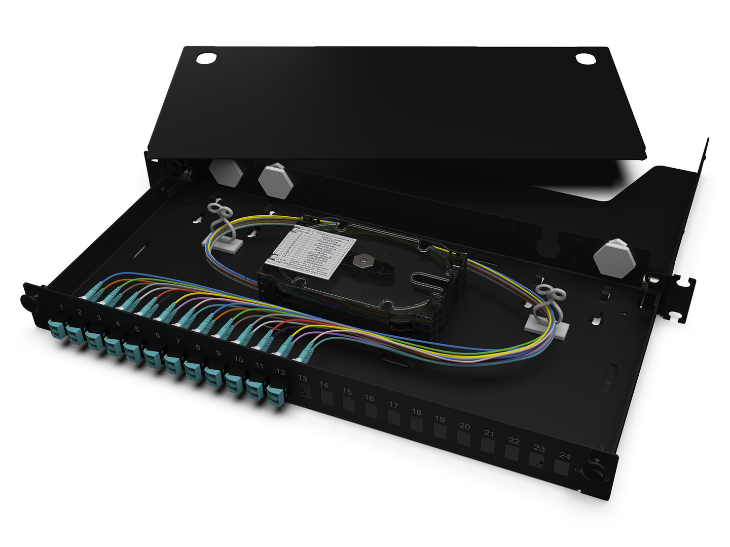 Spleiß-Verteilerfeld mit Kupplungen, Spleißkassetten und Pigtails (PGTL), LC Duplex OM3/4, 12 Fasern, türkis Kupplungen, schwarz