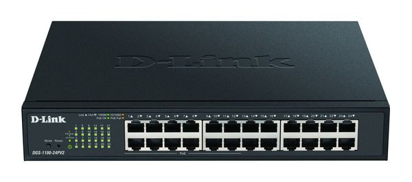 Die Smart Switches der DGS-1100V2-Serie von D-Link sind eine preisgünstige Lösung für Heim- und Kleinbüros, kleine und mittlere Unternehmen sowie Großunternehmen, die in Zweigstellen oder Konferenzräumen eine unkomplizierte Netzwerkanbindung benötigen. Der DGS-1100-24PV2 ist lüfterlos und verfügt über ein kompaktes Metallgehäuse und 24 Gigabit Ports, davon 12 mit PoE.