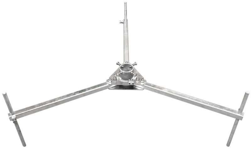 Dreibeinstativ zum freien Errichten von Stützrohren DEHNiso-Combi (D50 Länge 3200 mm). Zum Errichten mit Betonsockeln mit Keiltechnik, ohne zusätzliche Befestigung an Konstruktionselementen. Mit Anpassung an die Dachneigung bis max. 10°. Ausführung klappbar, speziell für die innenverlegte HVI Leitung im Stützrohr. Um den Biegeradius der HVI Leitung unten am Dreibeinstativ einzuhalten, werden zwei Betonsockel unterhalb des Schenkels und einer oberhalb positioniert.