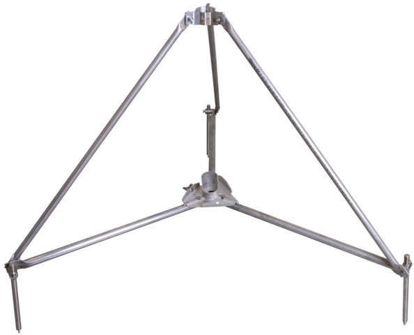 Dreibeinstativ (Ausführung klappbar) für Stützrohre D 50 mm mit seitlichem Auslass oder Fangstange D 40 mm mit Reduzierungszubehör. Mit Doppelüberleger für den Anschluss 2x Rd 8-10 mm, zum Errichten mit Betonsockel (Gewicht 17 kg) mit Anpassung mittels Sockelhalterset an die Dachneigung bis max. 10°.