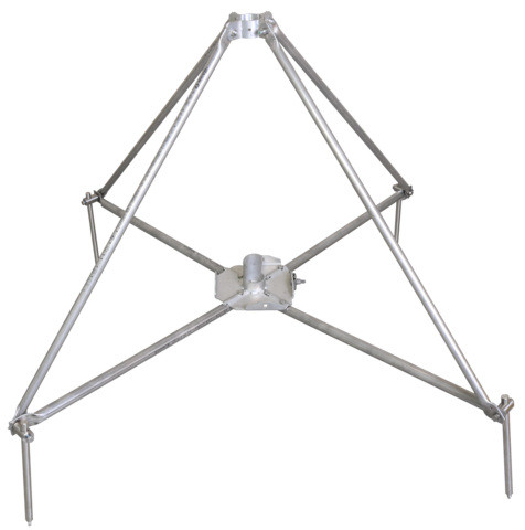 Vierbeinstativ (Ausführung klappbar) für Stützrohre D 50 mm mit seitlichem Auslass oder Fangstange D 40 mm mit Reduzierungszubehör. Mit Doppelüberleger für den Anschluss 2x Rd 8-10 mm, zum Errichten mit Betonsockel (Gewicht 17 kg) mit Anpassung mittels Sockelhalterset an die Dachneigung bis max. 10°.