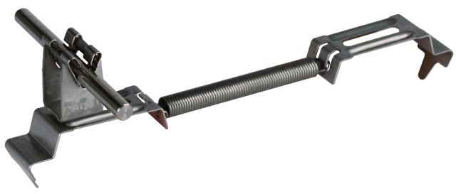 Dachleitungshalter SPANNgrip zum Befestigen von Fangleitungen auf dem Firstziegel z. B. bei Ziegeldächer. Mit Befestigung durch NIRO-Zugfeder mit Leitungshalter DEHNgrip, lose Leitungsführung, seitlich verstellbar.