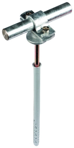 Stangenhalter mit geschlitztem Überleger und Abdeckbund, zum Befestigen von Fang- und Erdeinführungsstangen Rd 16 mm, an Wänden mit Wärmedämm-Verbundsystem. Ausführung mit Zweischrauben-Überleger und fester Leitungsführung.