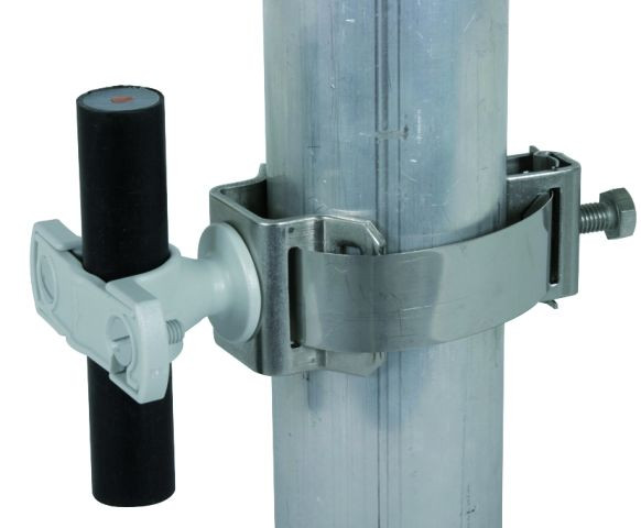 Leitungshalter mit Spannband, zum Befestigen der HVI Leitung (schwarz) oder HVI Leitung light z. B. an Rohren. Ausführung mit Kunststoff-Leitungshalter.