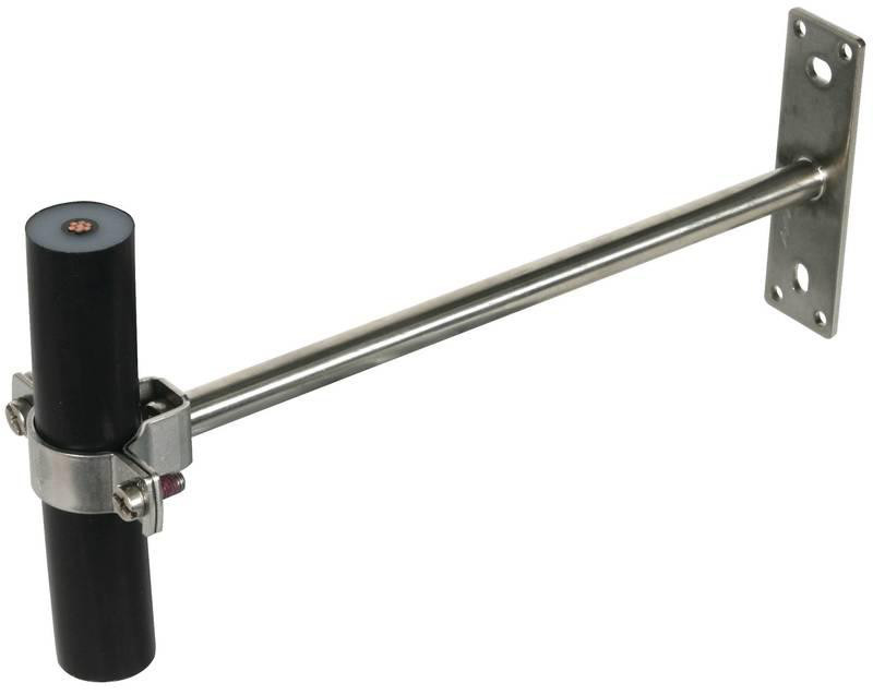Leitungshalter für die Verlegung der HVI power-Leitung in explosionsgefährdeten Bereichen der Ex-Zone 1 (Gase, Dämpfe, Nebel) sowie Ex-Zone 21 (Stäube). Die besonderen Installationsbedingungen stellen sicher, dass ein elektrischer Funke zu benachbarten metallenen Teilen beim Blitzstromdurchgang durch die HVI power Leitung verhindert wird. Ausführung mit Distanzstab Abstand 240 mm, zur Befestigung auf metallenen Konstruktionsteilen (z. B. Fassaden).