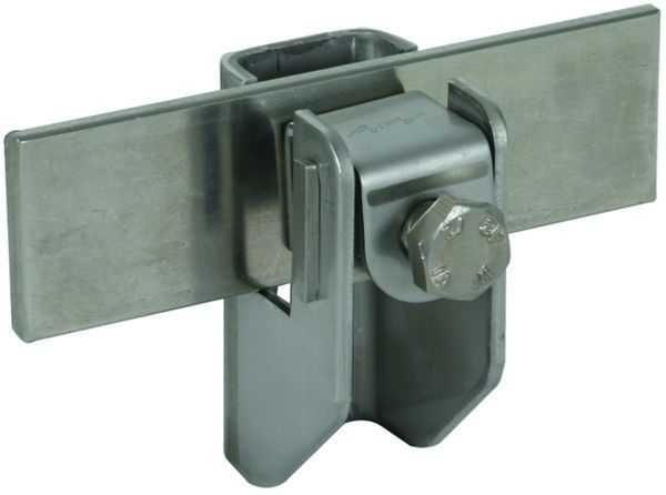 Flachbandhalter mit Druckstück (Schraube M8), für das Verlegen von Flachband bis 11 mm und Rundleitern 6-10 mm, feste Leitungsführung. Ausführung mit Wandabstand 11 mm.