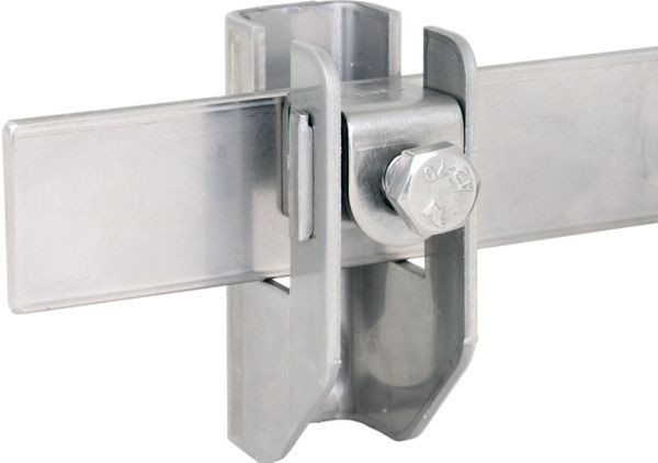 Flachbandhalter mit Druckstück (Schraube M8), für das Verlegen von Flachband bis 11 mm und Rundleitern 6-10 mm, feste Leitungsführung. Ausführung mit Wandabstand 15 mm.