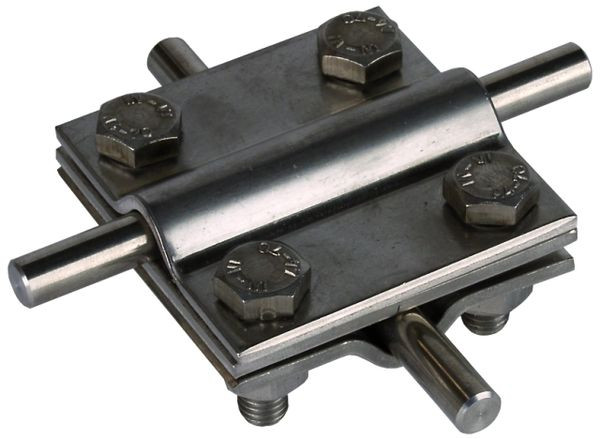 Kreuzstück nach DIN EN 62561-1, für ober- und unterirdische Verbindung von Rund- und Flachleitern. Ausführung mit Zwischenplatte und Schrauben M8.