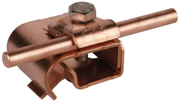 Dachrinnenklemme nach DIN EN 62561-1, zum Verbinden von Rundleitern dem Wulst der Dachrinne. Ausführung mit Klemmbock, Leitungsführung längs oder quer.