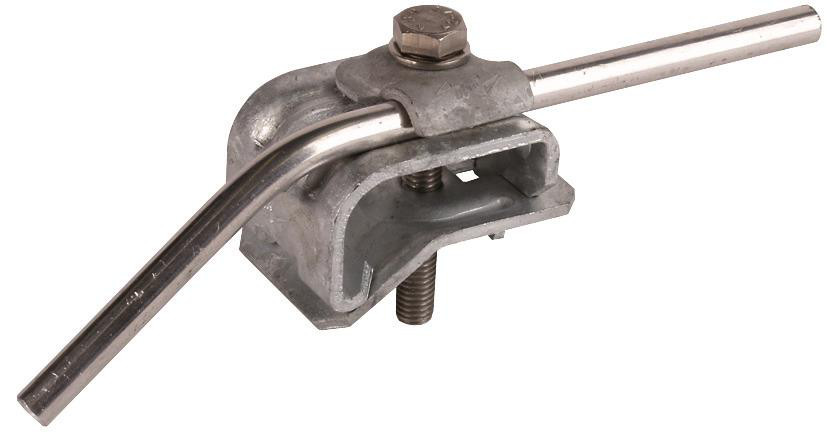 Dachrinnenklemme nach DIN EN 62561-1, zum Verbinden von Rundleitern dem Wulst der Dachrinne. Ausführung in Einschraubentechnik mit Klemmbock, Leitungsführung längs.