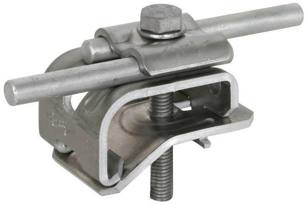 Dachrinnenklemme nach DIN EN 62561-1, zum Verbinden von Rundleitern dem Wulst der Dachrinne. Ausführung in Einschraubentechnik mit Doppelüberleger, Leitungsführung längs.