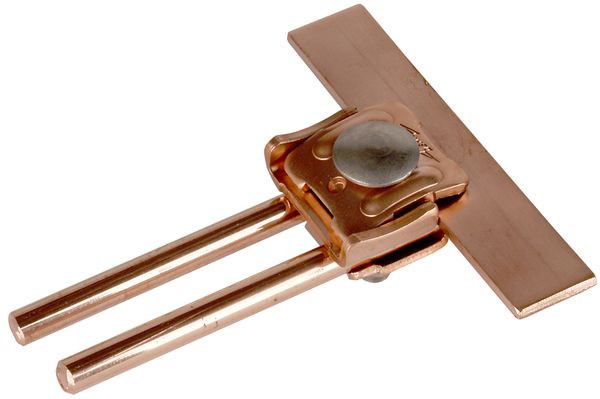 Falzklemme nach DIN EN 62561-1, zum Verbinden von Rundleitern mit Falzen. Ausführung mit Doppelüberleger, Leitungsführung längs oder quer.