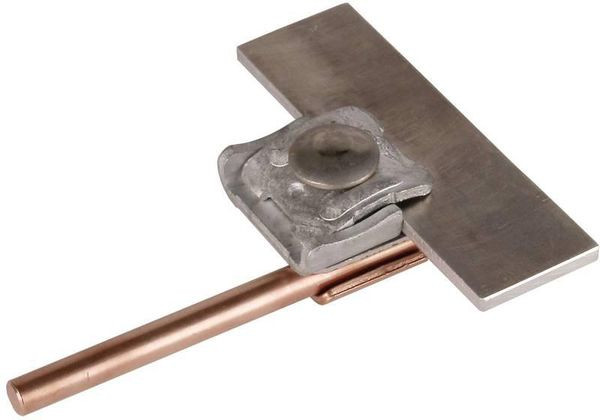 Falzklemme nach DIN EN 62561-1, zum Verbinden von Rundleitern mit Falzen. Ausführung Zweimetall für Falze St/tZn mit Zwischenplatte (Cupal), Leitungsführung längs oder quer.