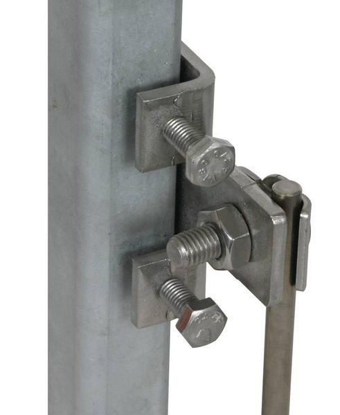 Anschlussklemme für Stahlträger nach DIN EN 62561-1, für den Anschluss an Stahlkonstruktionen. Ausführung waagrecht mit Klemmbock, Anschluss längs oder quer.