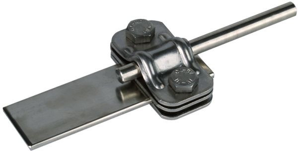 UNI-Trennklemme nach DIN EN 62561-1, zum Verbinden der Ableitung mit der Erdeinführung. Ausführung mit Zwischenplatte für Rund- und Flachleiter.