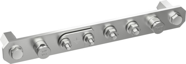 Potentialausgleichsschiene aus NIRO (V4A) für den Schutz und Funktionspotentialausgleich und den Blitzschutzpotentialausgleich. Mit 6-Kant Stützer M10. Ausführung mit 6 Anschlüssen über zwei KS-Verbinder, einem Flachleiteranschluss und zwei Anschlüsse über Schraube und Mutter.