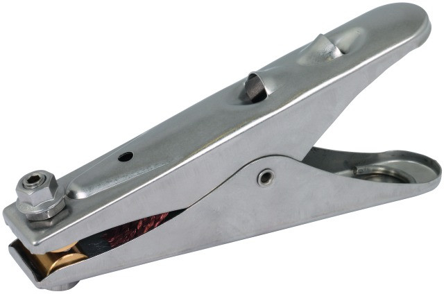 Erdungszange zur kontrollierten Erdung / ableiten statischer Aufladung von Tankwagen, Flugzeugen, Containern und Behältern. Auch für die Anwendung in explosionsgefährdeten Bereichen geeignet. Ausführung groß, zwei Messingbacke mit Stahlspitzen. Anschluss: Gewindebolzen M10 mit Mutter.