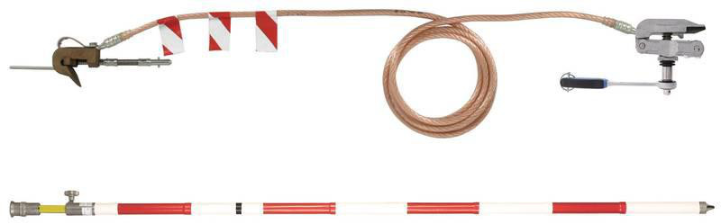 Erdungs- und Kurzschließvorrichtungsset (nicht profilfrei) nach DIN VDE 0683-100 (EN/IEC 61230) zum Erden und Kurzschließen elektrischer Oberleitungen an der Arbeitsstelle nach DIN VDE 0105-100 (EN 50110). Inklusive Teleskop-Erdungsstange und einpolige Erdungs- und Kurzschließvorrichtung, 8,5 m lang, Ausführung Ratsche.