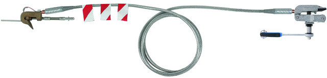 Einpolige Erdungs- und Kurzschließvorrichtung nach DIN VDE 0683-100 (EN/IEC 61230) für Oberleitungen elektrischer Bahnen,; 8,5 m lang, mit Fahrdraht-Erdungsklemme und Schienenanschlussklemme (Ratsche) bestückt.