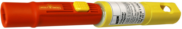 Adapter mit Zahnkupplung und Flach-Steckbuchse 18 x 7 mm. Zur Aufnahme von WOLF-Gartengeräten.