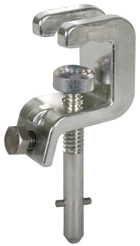 Universalklemme, Spindel mit Querstift als phasenseitiges oder erdseitiges Anschlusselement nach DIN VDE 0683-100 (EN/IEC 61230) für Kugelfestpunkte, T-Festpunkte, Flach- und Rundleiter zur Bestückung von Erdungs- und Kurzschließseilen. Mit Verdrehungsschutz Ausführung PK 1.
