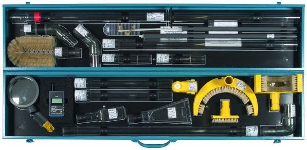 Trockenreinigungsset TRS MS nach DIN VDE 0682-621 zum Reinigen durch Absaugen unter Spannung bis 36kV / 15 ... 60 Hz von Transformatoren und Schaltanlagen in Innenraum- und Freiluftanlagen, komplett im passenden Transportbehälter. Speziell angepasste Arbeitsköpfe zur Intensivreinigung. Steckkupplungssystem zum schnellen Umrüsten der Arbeitsköpfe. Saugluftregulierung im Handhabebereich. Transparente Saugrohre für mehr Sicherheit.