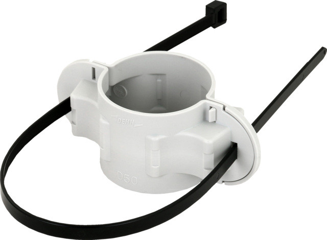 Befestigungsset zur Montage der HVI long Leitung an Stützrohren, bestehend aus zwei Halbschalen und einen Kabelbinder zum Befestigen von bis zu vier HVI Leitungen im GFK-Bereich des Stützrohres.