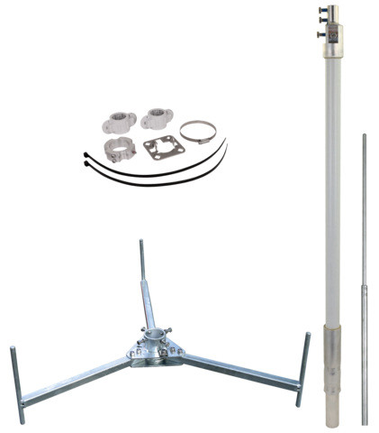 Fangmast für HVI light plus Leitung, für die Errichtung auf Flachdächern, mit Anpassung an die Dachneigung bis max. 10°. Komplett mit Vierfachanschlussplatte für die HVI light plus Leitung, Befestigungsset zur Montage der Leitung und Dreibeinstativ. Gesamthöhe 3700 mm, inkl. Stützrohr GFK/Al und Fangsspitze.