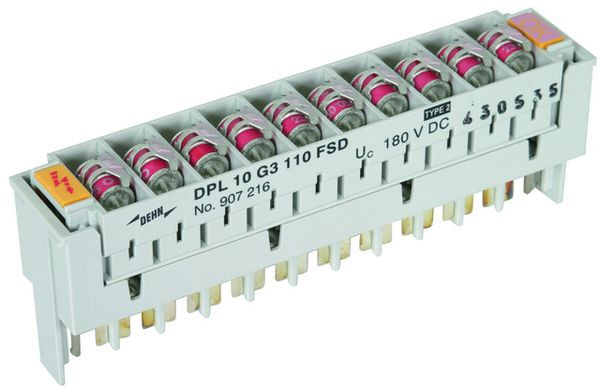 Steckmagazin für 10 DA mit dreipoligen Gasentladungsableitern für nahezu alle Anwendungen. Die Ableiter verfügen über eine fail-safe-Funktion und zusätzlich eine optische Anzeige nach Auslösen des fail-safe. So kann sofort erkannt werden, ob ein Ableiter ausgetauscht werden muss.