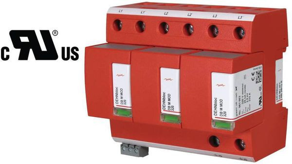 Dreipoliger Blitzstromableiter DEHNguard MU, Open-Type 1 SPD nach ANSI/UL 1449 4th Ed. bestehend aus Basisteil und gesteckten Schutzmodulen auf Funkenstreckenbasis. Ermöglicht Endgeräteschutz. Zum Schutz von 3 Phase Wye Systemen.