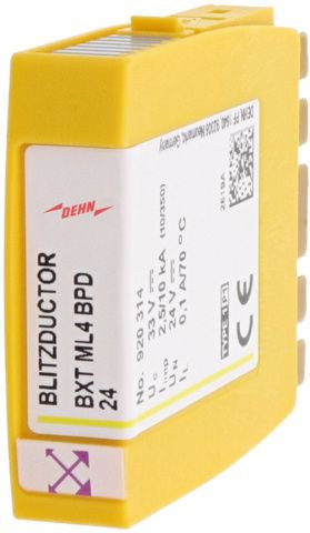Platzsparendes Kombiableiter-Modul mit LifeCheck zum Schutz von 2 Doppeladern in 24 V DC Systemen. Mit integrierten PTC Widerständen für einen Überstromschutz bis 40 A. LifeCheck erkennt thermische oder elektrische Überlastzustände nach denen der Ableiter auszutauschen ist. Die Anzeige erfolgt berührungslos mittels DEHNrecord LC / SCM / MCM.
