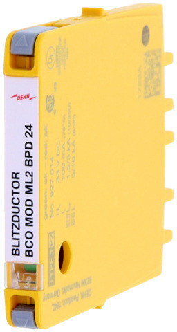 Kombi-Ableiter Schutzmodul in 6 mm Baubreite für BLITZDUCTORconnect mit Statusanzeige zum Schutz von 1 Doppelader in 24 V DC Systemen. Einsatz geeignet auch bei geerdetem Minuspol. Integrierte PTC-Widerstände ermöglichen ein sicheres Rücksetzen des Ableiters nach Störbeeinflussung im Anlagenkreis mit Kurzschlussströmen bis 40 A.