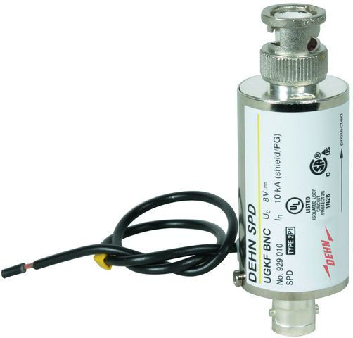 Zweistufiger Überspannungsableiter für Videokameras und Arcnet mit BNC-Anschluss mit indirekter Schirmerdung zur Vermeidung von Brummschleifen.