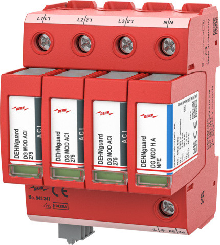 Mehrpoliger Überspannungsableiter DEHNguard MD ACI, Typ 2 nach EN 61643-11 mit integrierter ACI-Schalter-/Funkenstrecken - Kombination, bestehend aus Basisteil und gesteckten Schutzmodulen. Hohe Gerätesicherheit durch Ableiterüberwachung mit Thermo-Dynamik-Control. Zum Schutz von Niederspannungs-Verbraucheranlagen vor Überspannungen. Zum Einsatz im Blitz-Schutzzonen-Konzept an den Schnittstellen 0B – 1 und höher.